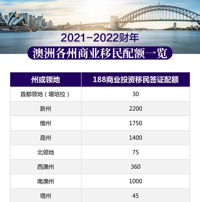 2021年7月1日起,澳洲商業和投資簽證最新政策正式實施(相關報道:新政!2021年7月1日起澳洲投資移民最新最全攻略)。目前,澳大利亞維州、南澳、西澳、首領地紛紛官宣了最新商業投資移民州提名新政,有意向移民澳洲的朋友們,請抓緊搶占新財年配額!
