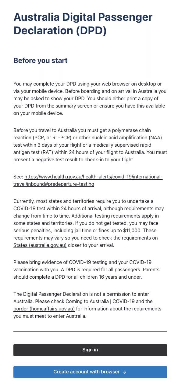 ·聲明已了解入境澳洲和您抵達(dá)的州或地區(qū)的檢疫和檢測(cè)要求,以及不遵守規(guī)定的處罰。