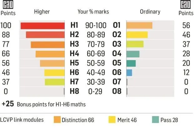 然后學生可以將獲得的百分制分數轉換成對應的CAO點數。這些點數疊加可用來申請理想的學校和專業。不過,學生申請的大學專業也需要與高考選取的科目有所關聯。