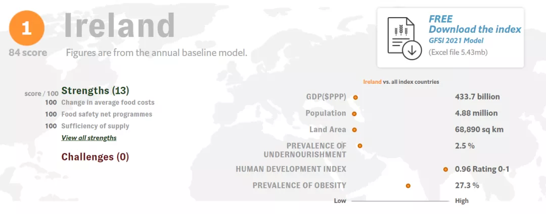 全球食品安全指數(Global Food Security Index,簡稱GFSI)排名已經發行了10年,在歷次排名中,愛爾蘭一直高居榜單前列。2014、2017年排名第一,2019、2020年位居第二。