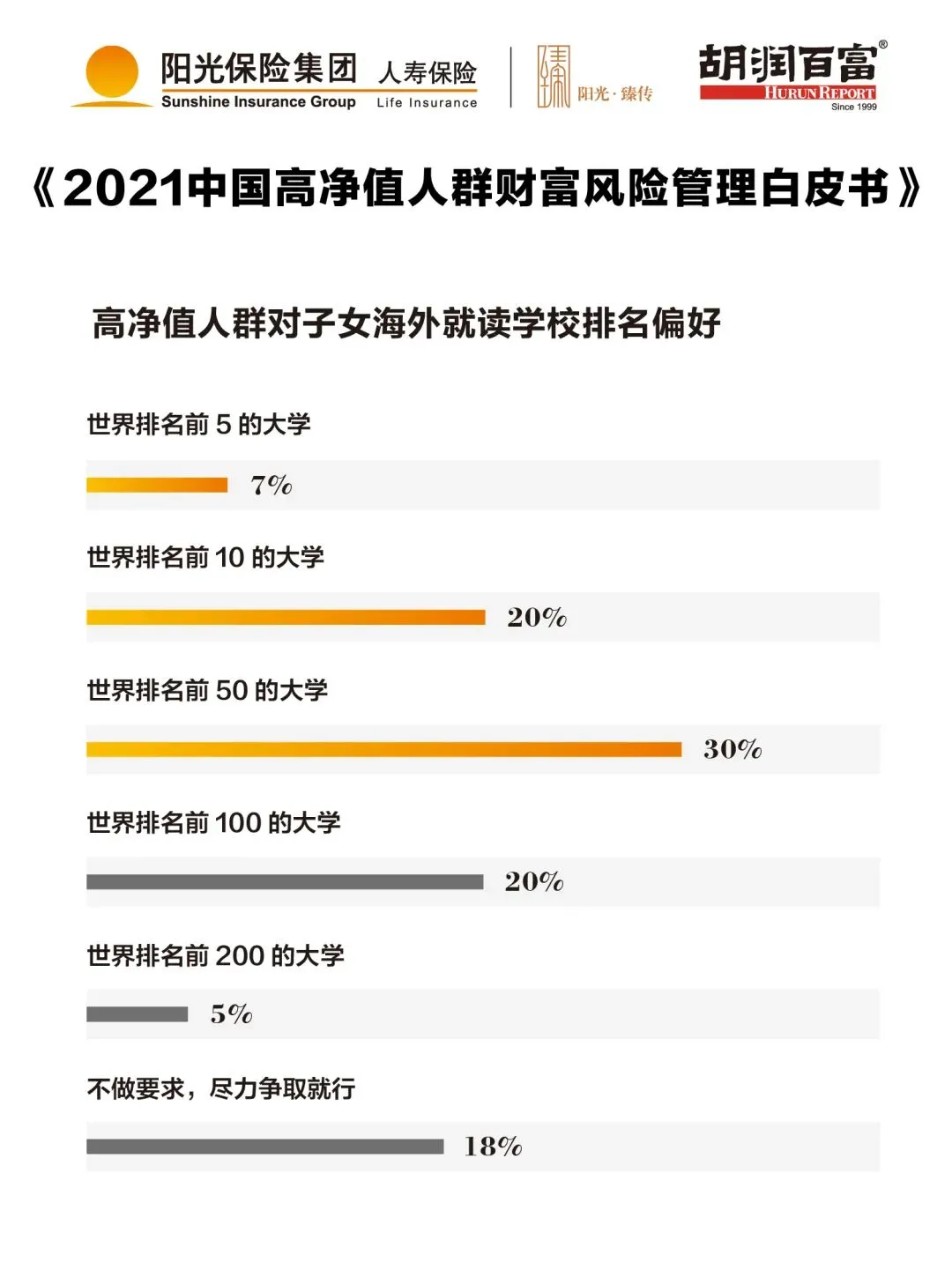 近八成受訪家庭傾向于讓子女接受海外教育,主要考慮高中(18%)和本科(26%)段作為起點(diǎn)。82%的家庭關(guān)注學(xué)校的世界排名,有57%的家長希望子女進(jìn)入世界排名前50的大學(xué)。