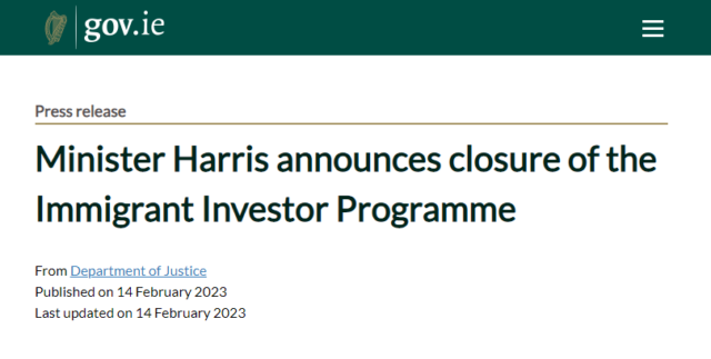 當地時間2月14日,愛爾蘭司法部重磅官宣:愛爾蘭投資移民計劃(IIP)于2023年2月15日工作日結束后正式關停。