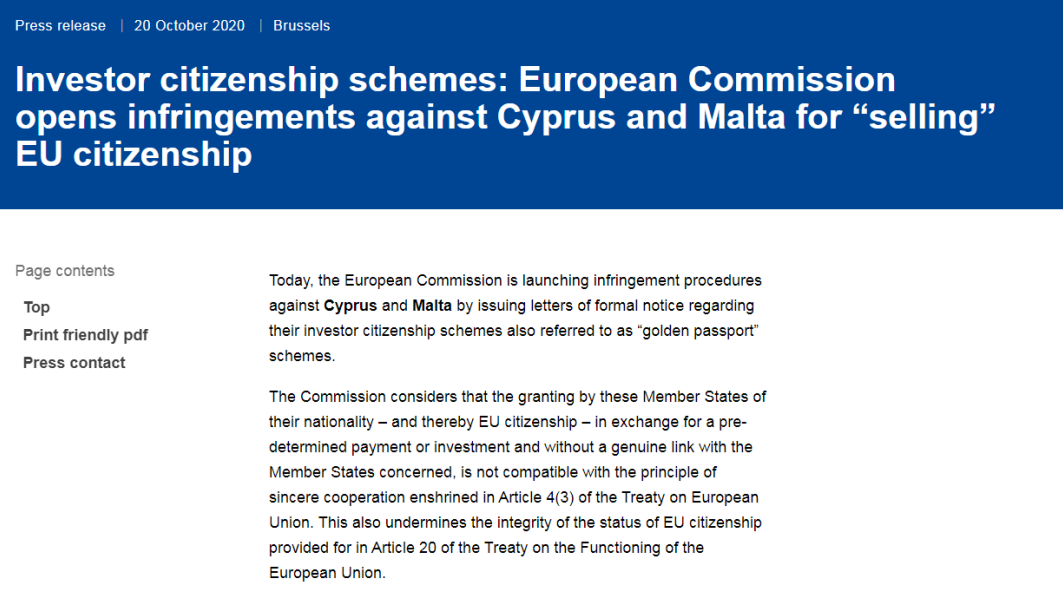 10月20日,歐盟委員會(huì)發(fā)布公告,宣布就“黃金護(hù)照”項(xiàng)目向塞浦路斯和馬耳他下發(fā)“正式通知函”,要求兩國(guó)政府在2個(gè)月內(nèi)做出答復(fù),據(jù)此正式啟動(dòng)對(duì)塞浦路斯和馬耳他的訴訟程序。