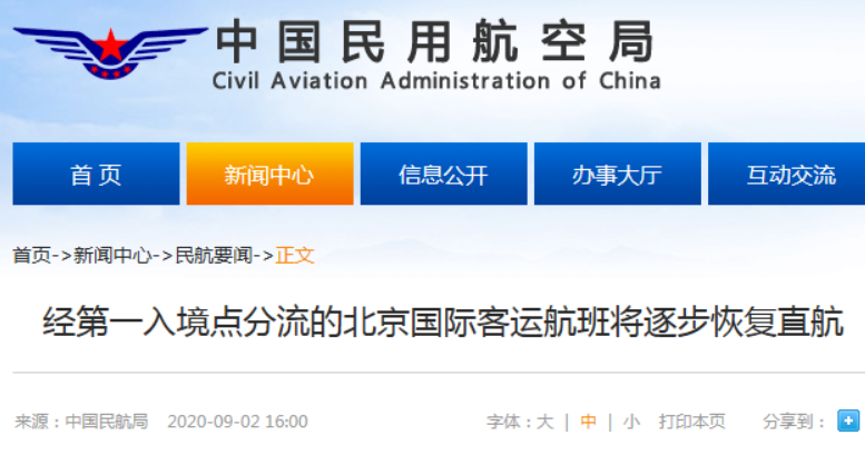 民航局9月2日發布消息稱,在嚴格采取防控措施、嚴格防范輸入風險的前提下,9月3日起逐步將經第一入境點分流的北京國際客運航班恢復直航。