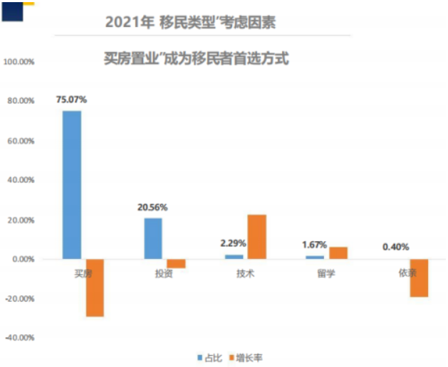 目前,移民市場上有很多種移民方式,投資移民、購房移民、技術移民、留學移民、親屬移民等等。在各種各樣的移民方式中,購房移民(占比75.07%)和投資移民(占比20.56%)是最便捷、最受歡迎的移民方式。通過海外購房或投資,不僅可獲取海外身份,還可實現(xiàn)資產(chǎn)分散配置、財富保值增值。