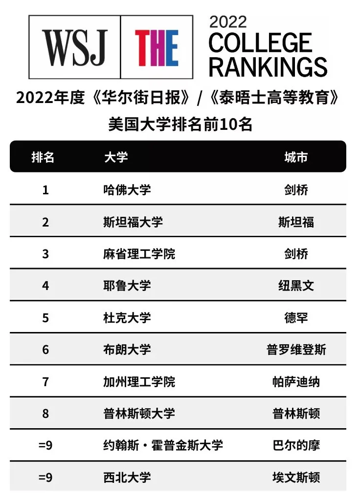 9月22日,泰晤士高等教育發(fā)布2022年度《華爾街日報(bào)》/《泰晤士高等教育》美國大學(xué)排名。本次排名共有來自近800所大學(xué)參與,哈佛大學(xué)連續(xù)6年位列榜首。斯坦福大學(xué),位居第二,麻省理工學(xué)院排名第三。約翰斯·霍普金斯大學(xué)的排名從第11名上升至第9名,成為唯一一所首次進(jìn)入前10名的大學(xué)。