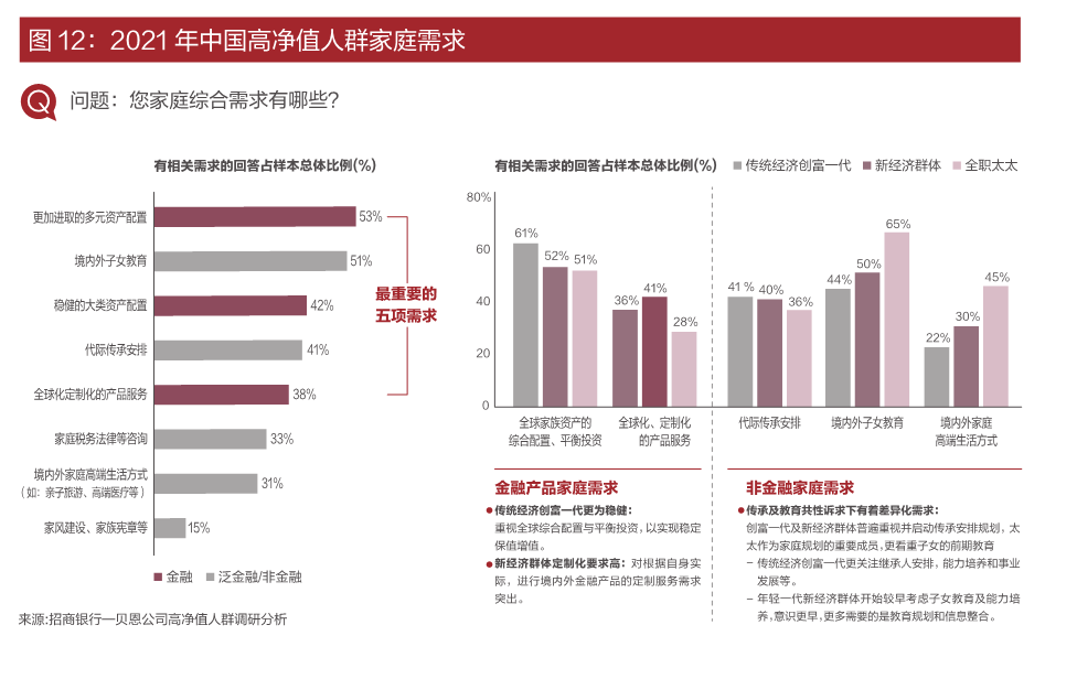 2021年,高凈值人群年輕化趨勢凸顯,40歲以下高凈值人群成為中堅力量,占比42%。縱觀2021年高凈值人群家庭需求,多元化的資產配置、境內外子女教育、穩健的大類資產配置、代際傳承安排、全球化定制化的產品服務占據了前5名。