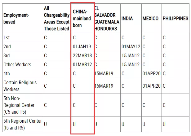 ·EB-5直投類別無排期;EB-5區域中心類別顯示“U”,受法案到期影響暫不可用。
