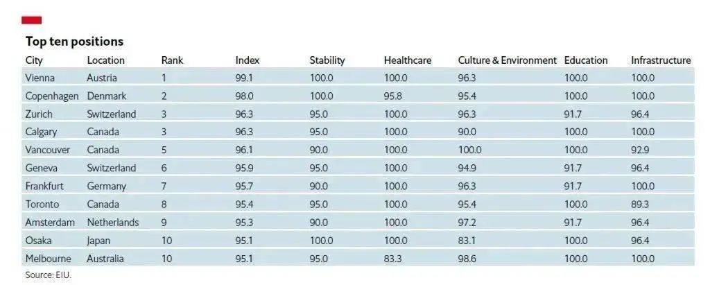 近日,英國經濟學人智庫發布了“2022年全球最宜居城市”排行榜。