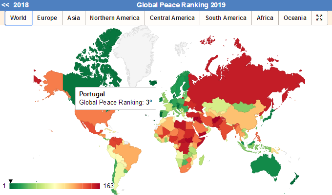 該報告以社會安全、國內(nèi)國際沖突和軍事化程度為測量領(lǐng)域,依據(jù)23項定量或定性指標,對世界163個國家(覆蓋全。球99.7%人口)的和平狀況作出分析與排序。2019排在全球和平指數(shù)前五名的國家分別是:冰島、新西蘭、葡萄牙、奧地利和丹麥。