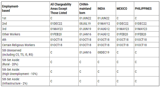 EB-3:技術類專業勞工排期為2019年4月1日,無變化;非技術勞工排期為2015年9月1日,前進139天