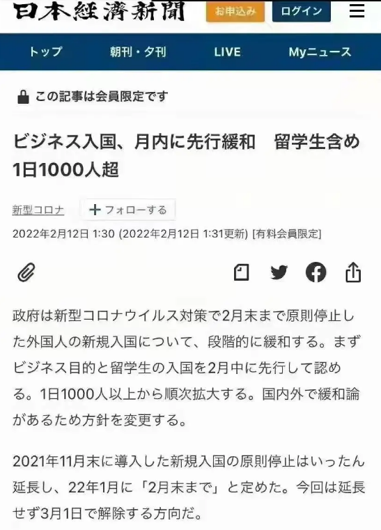 據日本經濟新聞2月12日消息:日本政府考慮不再延長“外國人新規入國禁止”政策,2月中旬起,先從商務和留學生簽證開始陸續開放入境,從每日允許1000人以上入境陸續擴大規模,預計從3月1日起,全面解除禁止外國人新規入境的政策。