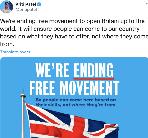 對此,英國內政大臣帕特爾表示:“全新的移民法案將徹底終結歐盟人口自由流動原則,并為我們推行新的積分制移民鋪平道路”。
