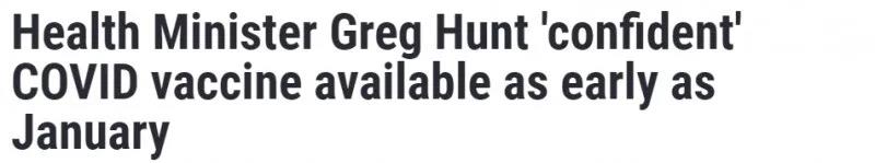 近日,澳洲聯邦衛生部長Greg Hunt透露,澳人最快可在2021年1月或2月就可以接種新冠疫苗。Hunt說:“我們與昆士蘭大學和牛津大學簽署了疫苗訂購協議,分別為5100萬劑和3380萬劑!但不論到時候澳人選擇接種哪種疫苗,每人都需接種兩劑。綜合來看,我們在2021年上半年就可以收到這些疫苗。我們對2021年第一季度充滿信心和希望”。