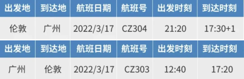 首班「?jìng)惗?廣州」直飛CZ304將于3月17日英國(guó)時(shí)間21:20由希思羅機(jī)場(chǎng)起飛,次日17:30抵達(dá)廣州白云機(jī)場(chǎng)。