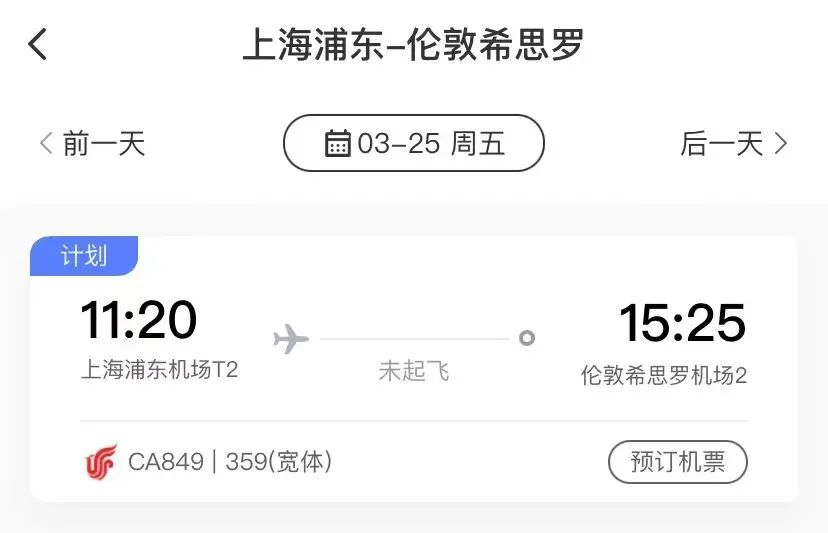 根據(jù)國(guó)航預(yù)訂系統(tǒng),CA850航班將于英國(guó)當(dāng)?shù)貢r(shí)間3月25日17:30從倫敦起飛,北京時(shí)間26日中午12:40到達(dá)上海。
